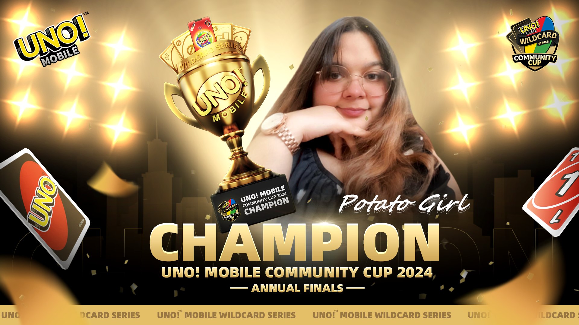 After a year of thrilling and unpredictable battles, we are thrilled to announce the Annual Champion of the UNO! Mobile Wildcard Series: Community Cup 2024 – Potato Girl from Wisconsin, USA! She takes home a $15,000 cash prize and the prestigious UNO! Mobile trophy, showcasing her remarkable achievements!