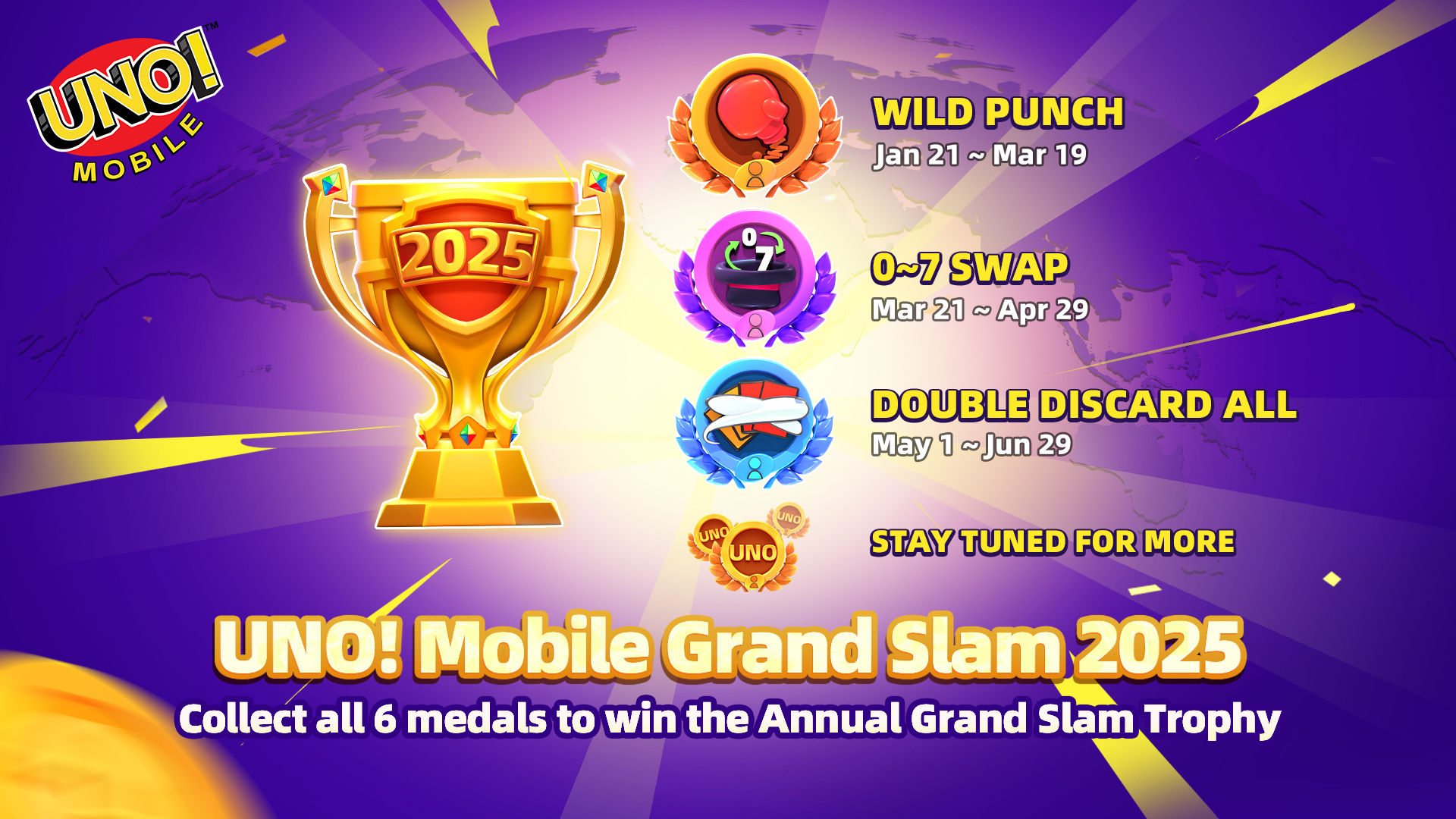 Keep the momentum going by continuing to compete in UNO! Mobile, including the newly launched Grand Slam Series, and don’t miss out on the highly competitive Ring Royale and Crown Royale events!